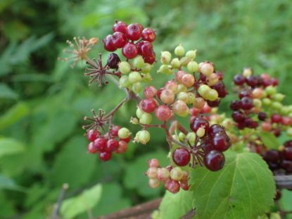 Large specimen for a moist, well-drained shady area. Clusters of red-purple berries in fall attract birds (but not for human consumption). Roots used to make root beer.